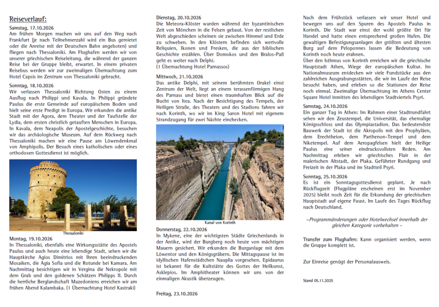 Gemeindemitglieder aus St. Petrus und der Lukaskirchengemeinde (ab Jan. Mirjam-Kirchengemeinde) können vom 17. – 26. Oktober 2026 an einer 9-tägigen Studien- und Pilgerreise “Auf den Spuren des Apostels Paulus in Griechenland” teilnehmen. Stationen sind Wirkungsstätten von Paulus wie Thessaloniki, Philippi, Korinth, Athen sowie Orte der griechischen Antike (Delphi, Mykene) und Christenheit (Meteora-Klöster). Das geistliche Programm gestaltet Pfr’in i.R. Gabriela Voß. Reisepreis: 1.890 € p.P. Näheres zu der Reise im Flyer des Veranstalters oneworldtours, der in den Kirchen ausliegt und über www.sankt-petrus-bonn.de abrufbar ist.