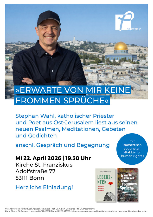 Unter dem Titel „Erwarte von mir keine frommen Sprüche“ lädt die Katholische Pfarrei St. Petrus herzlich zu einem besonderen Abend mit dem katholischen Priester und Poeten Stephan Wahl aus Ost-Jerusalem ein. In einer Lesung präsentiert er seine neuen Psalmen, Meditationen, Gebete und Gedichte, die durch ihre Ehrlichkeit und Tiefe berühren und zum Nachdenken anregen.