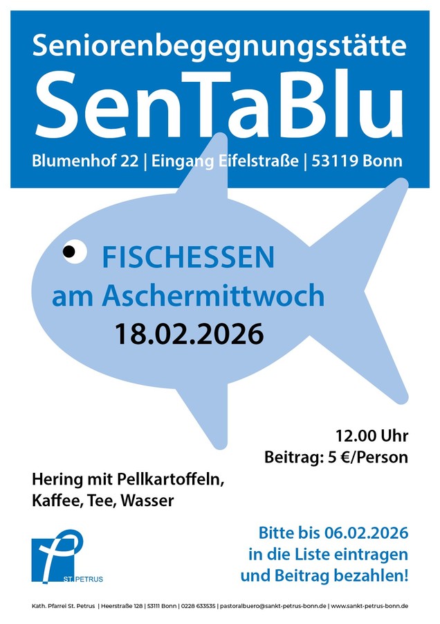 Herzliche Einladung am Aschermittwoch zum traditionellen Fischessen in der SenTaBlu (Blumenhof 22) um 12.00 Uhr.