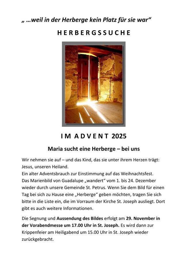 Vom 30.11. bis 24.12.2025 wandert das Marienbild von Guadalupe auch in diesem Jahr von Haus zu Haus durch unsere Pfarrgemeinde St. Petrus.