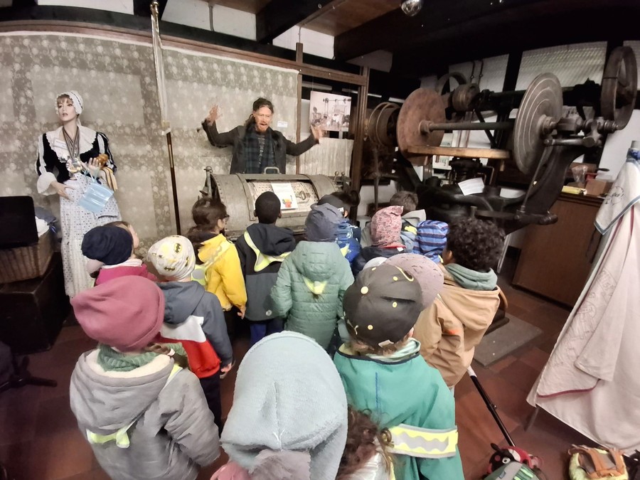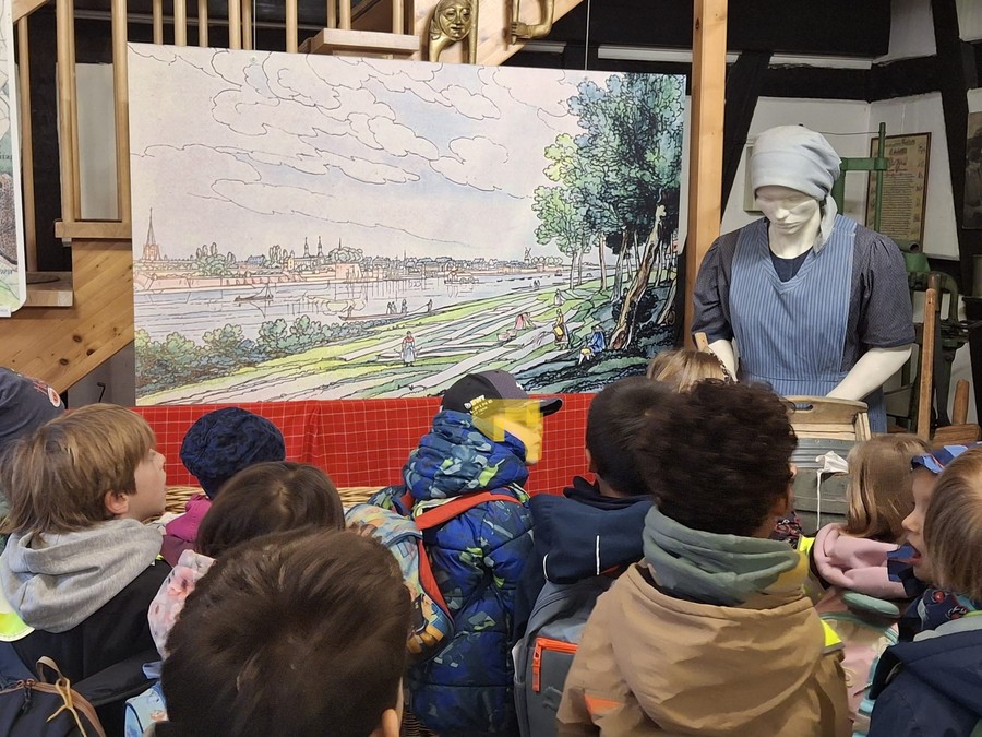 Im Museum konnten die Kinder sehen, wie früher in Beuel Wäsche gewaschen wurde. Besonders beeindruckend waren die alten Waschmaschinen und Waschbretter. Sie erfuhren, dass viele Frauen früher direkt am Rhein ihre Wäsche gewaschen haben. Das war harte Arbeit: Die Waschweiber bekamen vom vielen Schrubben starke Muskeln. Gleichzeitig war das kalte Wasser für ihre Hände sehr belastend, sodass die Haut oft krank wurde und sich dunkel verfärbte.